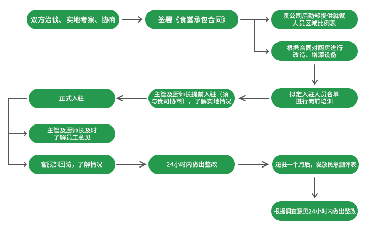 ●廠(chǎng)方提供食堂工(gōng)作(zuò)人(rén)員(yuán)的(de)宿舍,就(jiù)職的(de)員(yuán)工(gō₩ng)必須遵守雙方公司制(zhì)度,食堂工(gōng)作(zuò)人(rén)員(yuán)的(de)工(±gōng)資、保險、福利均由我方承擔。